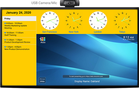 Aldo Presenter is designed to address a broad range of use cases; from starting an instant presentation to an enterprise workflow where scheduling a conference room is supported. Access to the Aldo Admin portal enables company administrators to deploy many displays across the enterprise and remotely setup each display with a custom image and Display Name (Conference Room name) and control user access to the display and to schedule them in Aldo Meetings.